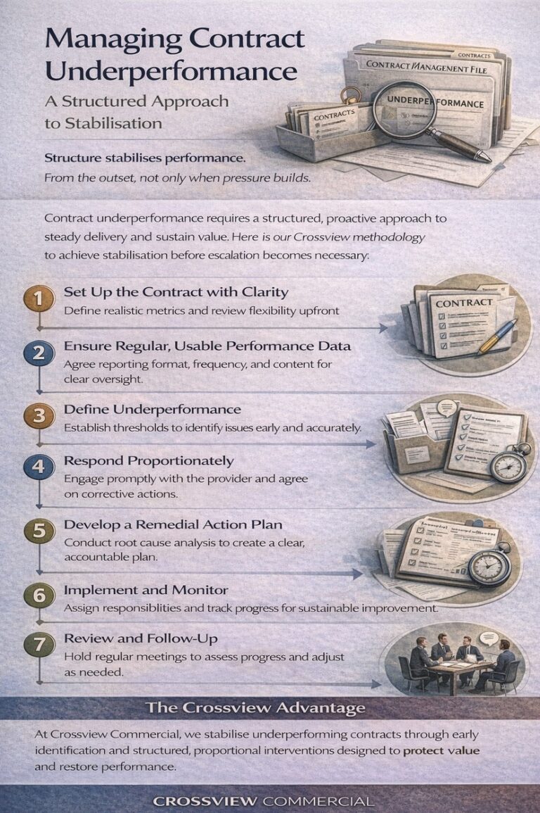 At Crossview Commercial, we treat contract underperformance as a structural issue, not simply a performance incident.