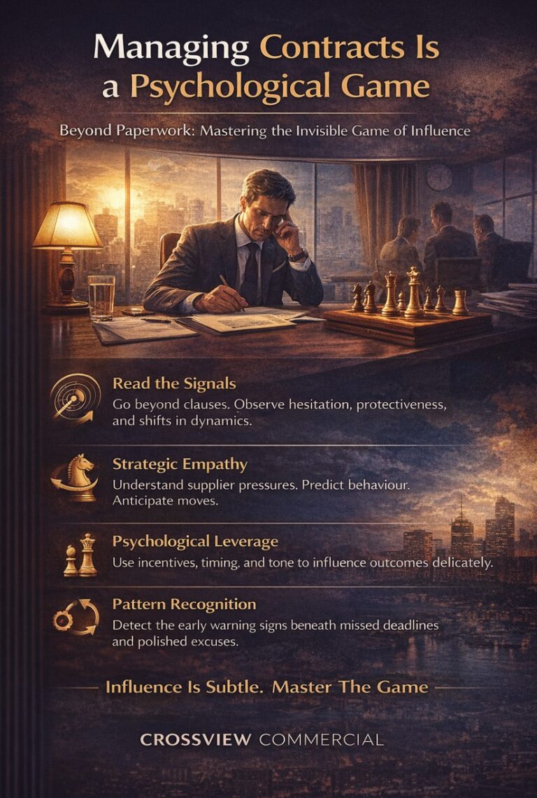 Crossview Commercial was built on the belief that strong contract management is as much behavioural intelligence as it is technical rigour. We combine commercial structure, strategic clarity and psychological insight to help organisations influence performance, stabilise delivery and regain control when complexity rises. Because in high-stakes services, knowing the contract is expected. Knowing how to play it is what creates results.