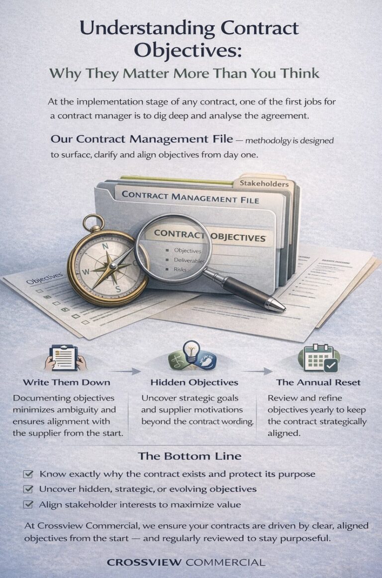 At Crossview Commercial, we treat contract objectives as the foundation of effective contract management – not a formality at the front of the document.